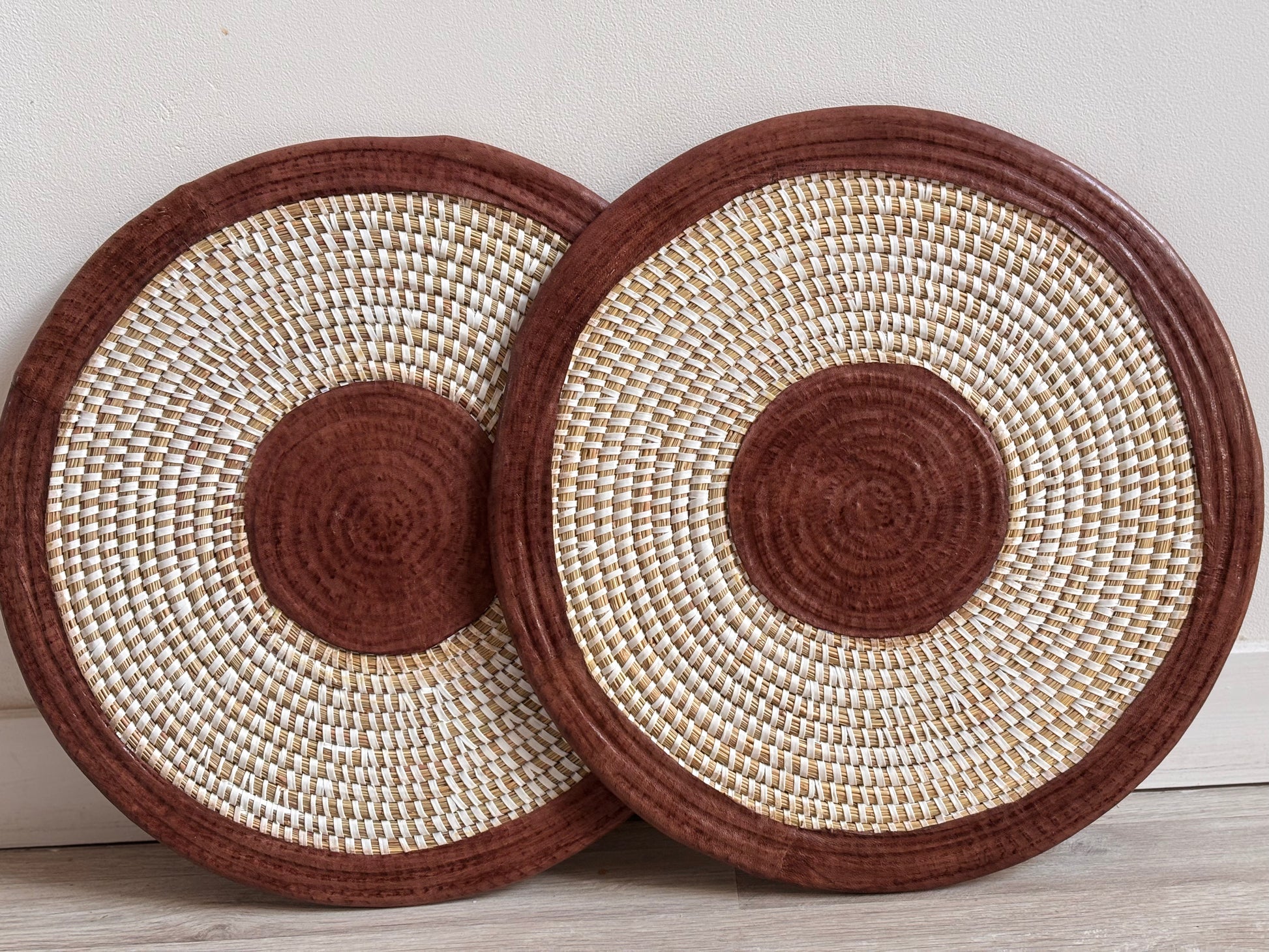 Hommage à l’hospitalité sénégalaise, le dessous de plat TERANGA allie lignes épurées et matières nobles. Tressé à la main par des artisans qualifiés, il mêle fibres naturelles et cuir véritable dans un design circulaire intemporel.